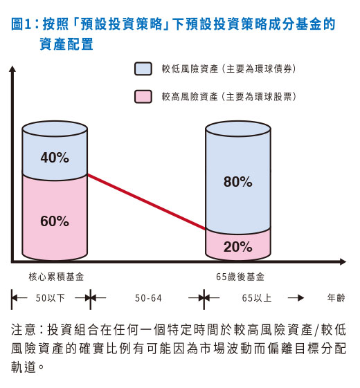 預設投資策略透過於不同年齡按照預定配置百分比來投資於兩項成分基金 ( 即核心累積基金與 65 歲後基金 ) ,旨在平衡風險與回報的長期影響。核心累積基金會將約 60% 的資產淨值投資於較高風險資產 ( 較高風險資產一般指股票或類似投資 ) 及約 40% 的資產淨值投資於較低風險資產 ( 較低風險資產一般指債券或類似投資 ) ,而 65 歲後基金則會將約 20% 的資產淨值投資於較高風險資產及約 80% 的資產淨值投資於較低風險資產。兩項預設投資策略成分基金均採納環球分散的投資原則,並運用不同類別的資產,包括環球股票、固定收益、貨幣市場工具和現金,以及強積金法例容許的其他類別資產。